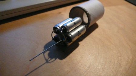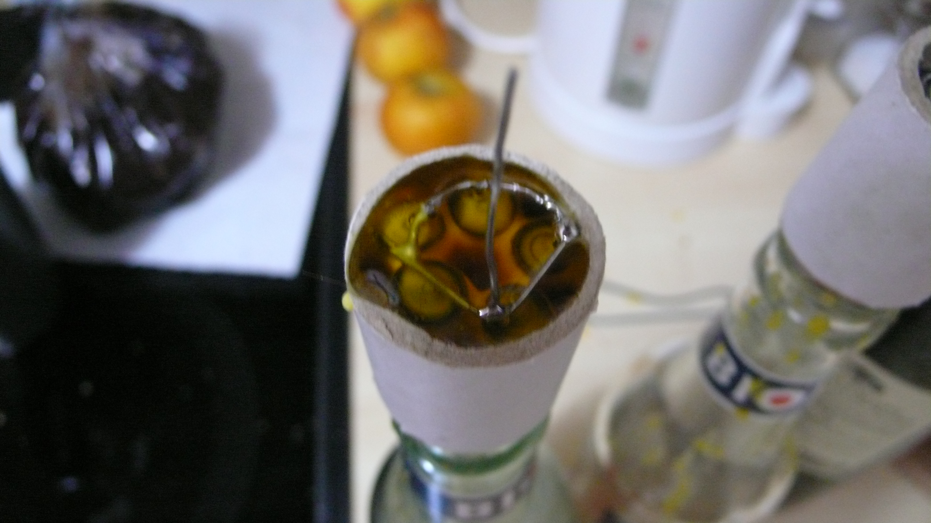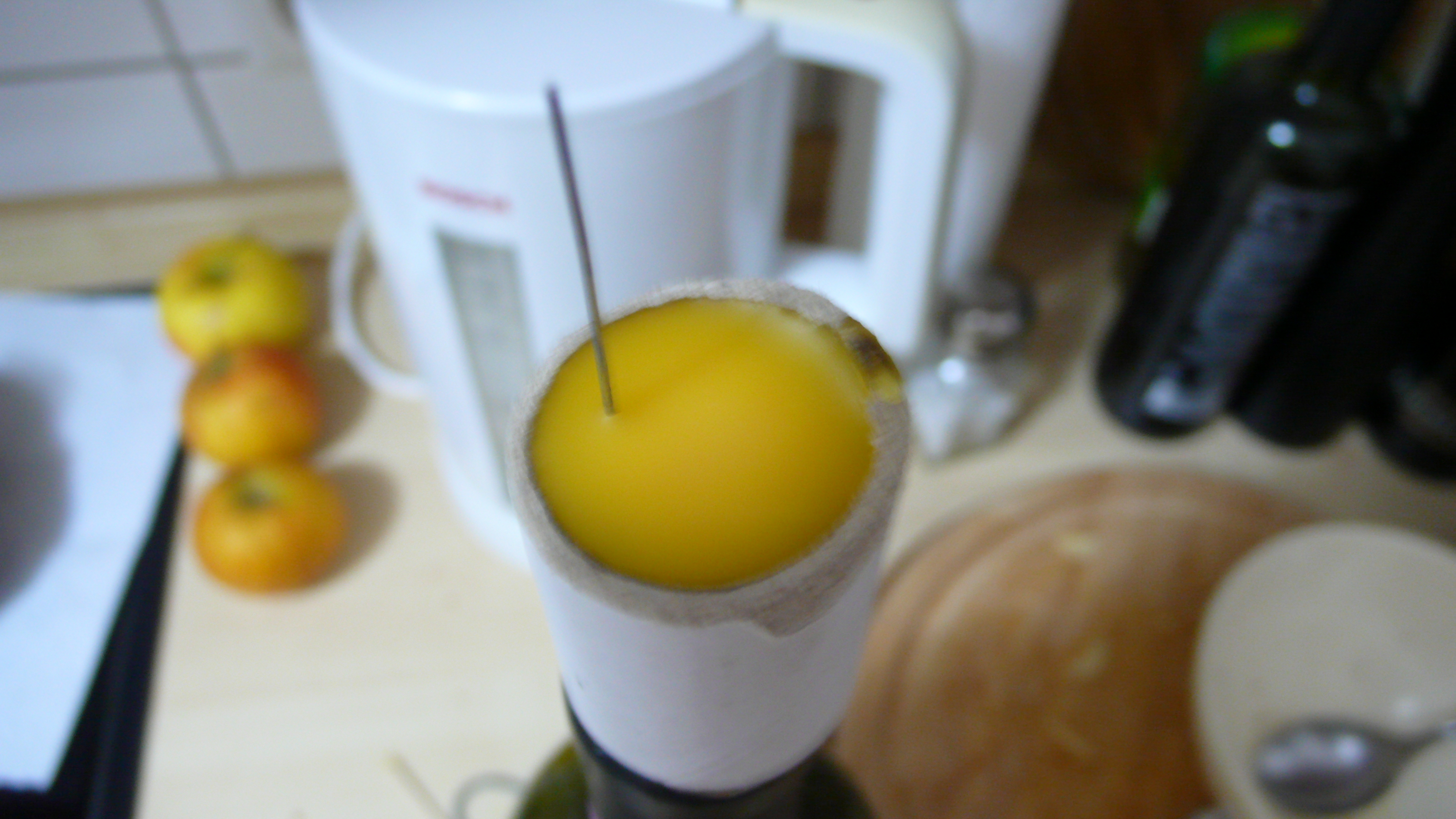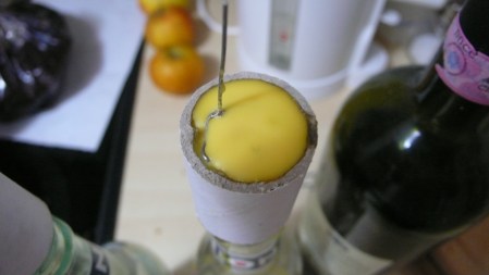 Als Behältnis dienen Abschnitte einer Papprolle, auf der Alufolie aufgewickelt war (die sind erstaunlich schwer in gerade Stücke zu zersägen!). Vergussmaterial ist reines Bienenwachs, das im Moment in jedem größeren Supermarkt in Kerzenform erhältlich ist. Preis für das Wachs für acht Kondensatoren: 2,50€. Es hat den Vorteil, völlig ungiftig, verfügbar, gut zu verarbeiten und hervoragend isolierend zu sein. „Cera Flava“, wie Bienenwachs wissenschaftlich heißt, wird schon sehr lange mit gutem Erfolg in der Elektrotechnik eingesetzt. Geschmolzen habe ich das ganze in einem kleinen Tiegel aus Alufolie im Wasserbad. Die untere Seite der Papprohre wurde mit einem Stück Karton versiegelt.