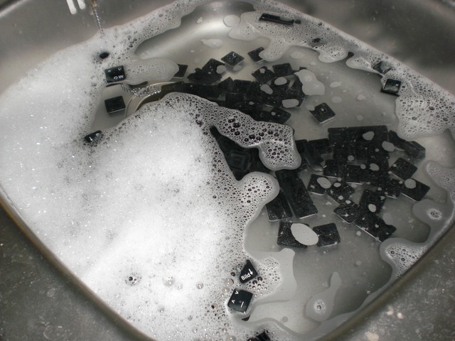Da planschen die siffigen Tasten noch fröhlich im heißen Schaumbad rum. Nun heißt es: Tasten putzen. Jede einzeln. Und es sind viele.