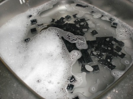 Hier lümmeln die Tasten auf der Fensterbank, in der Hoffnung besonnt und somit getrocknet zu werden. Währenddessen nehme ich die Tastatur mit ins Bad und schrubbe in Ermangelung eines Staubsaugers mittels einer Bürste den Dreck aus der Tastatur über der Badewanne raus. Natürlich ging mein Plan, die Tasten solarzutrocknen nicht auf: Die Sonne verschwand zum rechten Zeitpunkt, also wurden die Tasten vorm Puzzeln noch schnell einzeln handgetrocknet. Dieser Teil der Arbeit war übrigens recht unterhaltsam. Also der Puzzle-Teil.