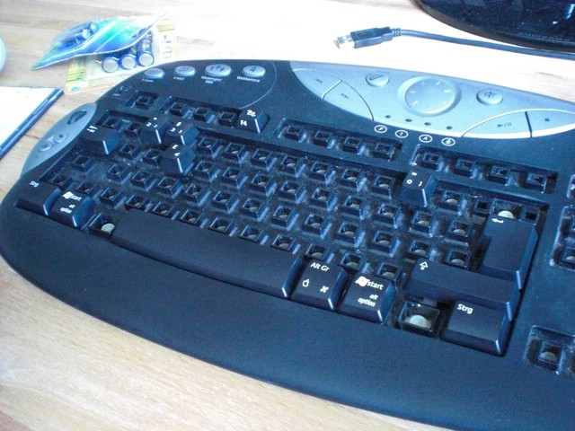 Hier also nun eine kleine Dokumentation dieser Tätigkeit. Die Bilder lassen leider nicht vermuten, wie dreckig diese Tastatur wirklich war.