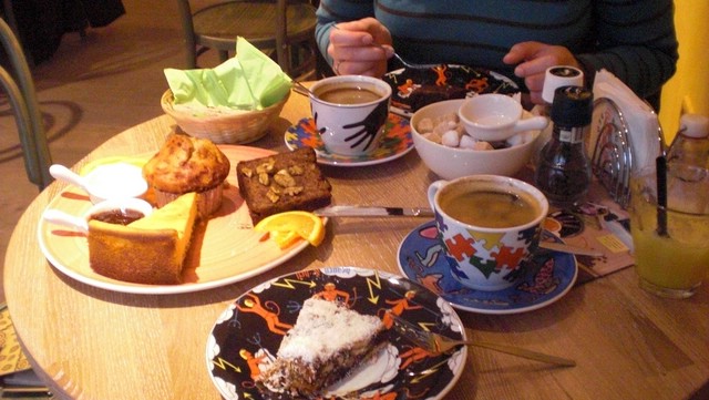 Zu dem „Süßes für zwei“-Teller, bestehend aus Dattelkuchen, Feigentorte, Brownie, Zimt-Apfel-Muffin, Zimt-Rosinen-Bagel und einem verflucht gutem Cheesecake, wird pro Person ein Becher Kaffee oder Tee gereicht. Für zwei Personen war das allerdings definitiv zu viel des Guten; daran kann man locker zu dritt essen (siehe unten).