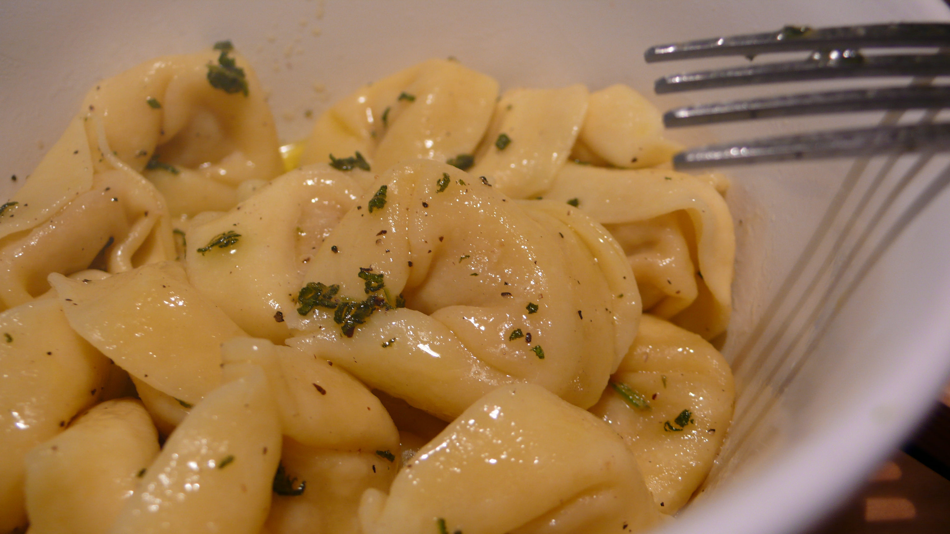 Das erste und einzige mal, dass ich dieser Zubereitungsart in der freien Wildbahn begegnet bin, war bei einem klitzekleinen Italiener in Münster. Der damalige Besitzer, leider inzwischen vom Erdboden verschwunden, hatte etliche kulinarische Kniffe auf und in der Pfanne, unter anderem auch dieses Rezept. Wobei: Von einem Rezept braucht man hier kaum sprechen, man muss nur die Idee einmal vermitteln. Tortellini oder Ravioli mit Fleischfüllung gar ziehen lassen, einen guten Brocken Butter in einer Pfanne auslassen und vier bis fünf gehackte frische Salbeiblätter, sowie etwas Salz und Pfeffer dazu geben. Kurz bei niedriger Hitze durchziehen lassen. Das eine in dem anderen schwenken, essen und dem Weg Zum Licht™ (rechtlich geschützt) ein bisschen näher sein…
