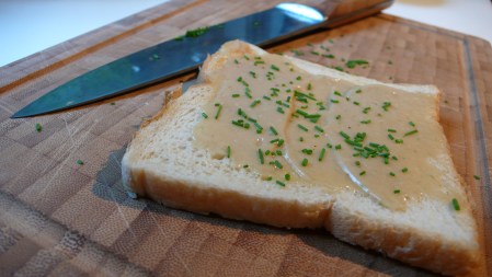 Diese Anchoïade, für deren mayonnaisigen Charakter ich vermutlich von jeder französischen Frau mit einer Reitpeitsche über den Hof gejagt werden würde – ein weiteres Vergnügen weniger also, das ich wie jeder andere bezahlen muss – ist eine wunderbare Creme auf Baguette oder Chiabatta. Für lustiges Kichern gibt es obendrauf gehackten Schnittlauch. Extrem lecker. Gefährdet akut meine kardiovaskuläre Gesundheit.