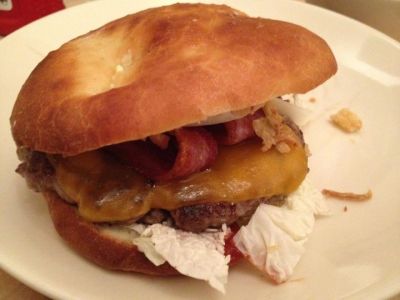 Die Zutaten werden gemischt und dann zu einem glatten Teig geknetet, etwa 6-8min in der Küchenmaschine. Dann darf der Teig eine Stunde gehen (abdecken nicht vergessen), wird dann portioniert und geformt, was rundliche Flatschen von etwa 12cm Durchmesser ergeben sollte. Diese dürfen dann erneut unter Folie für eine halbe Stunde gehen, werden dann etwa 15 Minuten bei 180° gebacken und sofort nach dem Backen mit flüssiger Butter bepinselt. Dass dann von unten nach oben Ketchup, Chinakohl, Quarterpound Pattie, Käse, Bacon, Zwiebeln, Röstzwiebeln und Remoulade auf den Burger gehören, sollte vielleicht noch einmal betont werden.