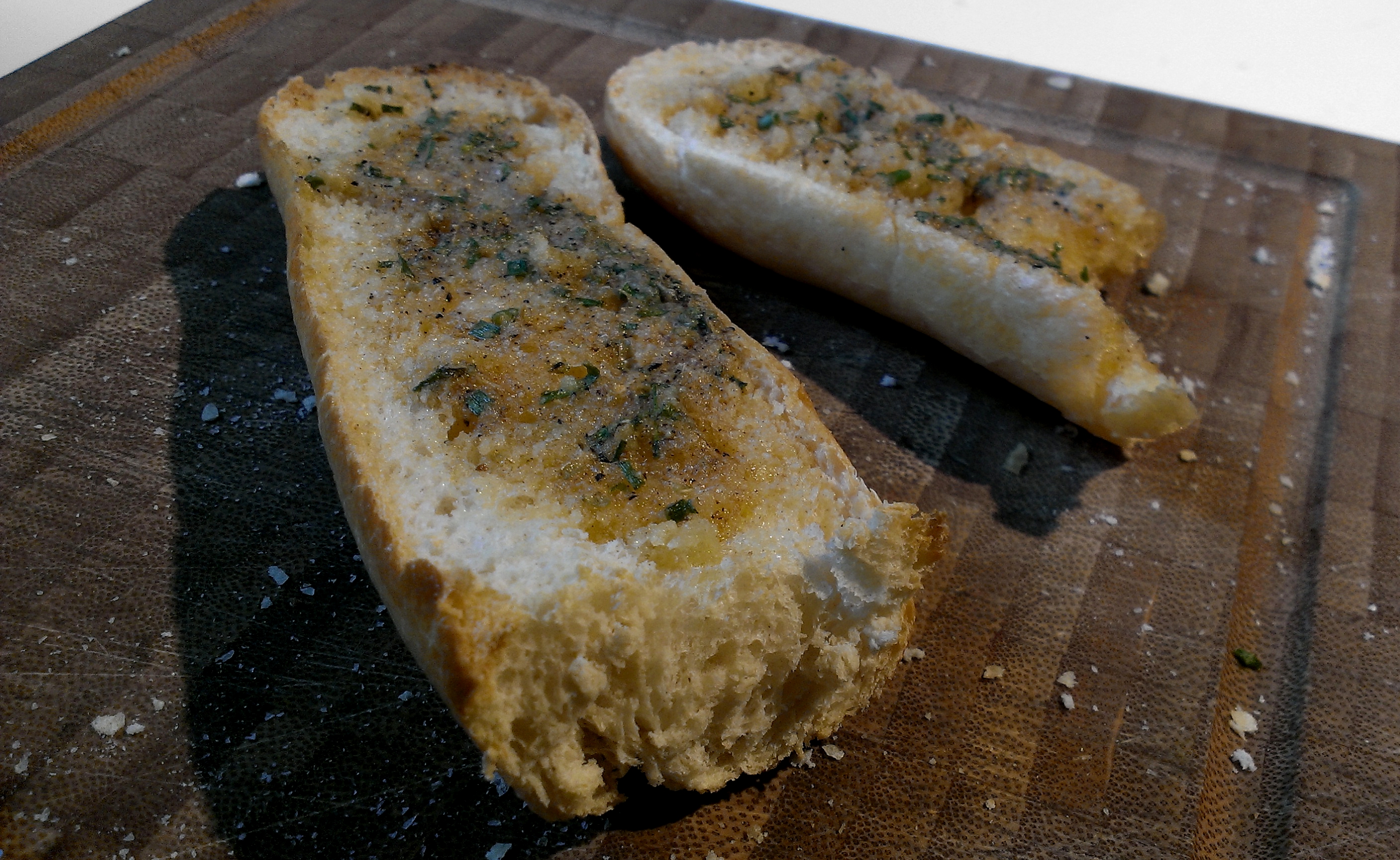 Knoblauchbutter (Kleingehackter Knoblauch, Zwiebelpulver, Rosenpaprika, Oregano, Salz & Pfeffer in zimmerwarme Butter einmanschen, evt. etwas ziehen lassen) auf Baguette verstreichen.