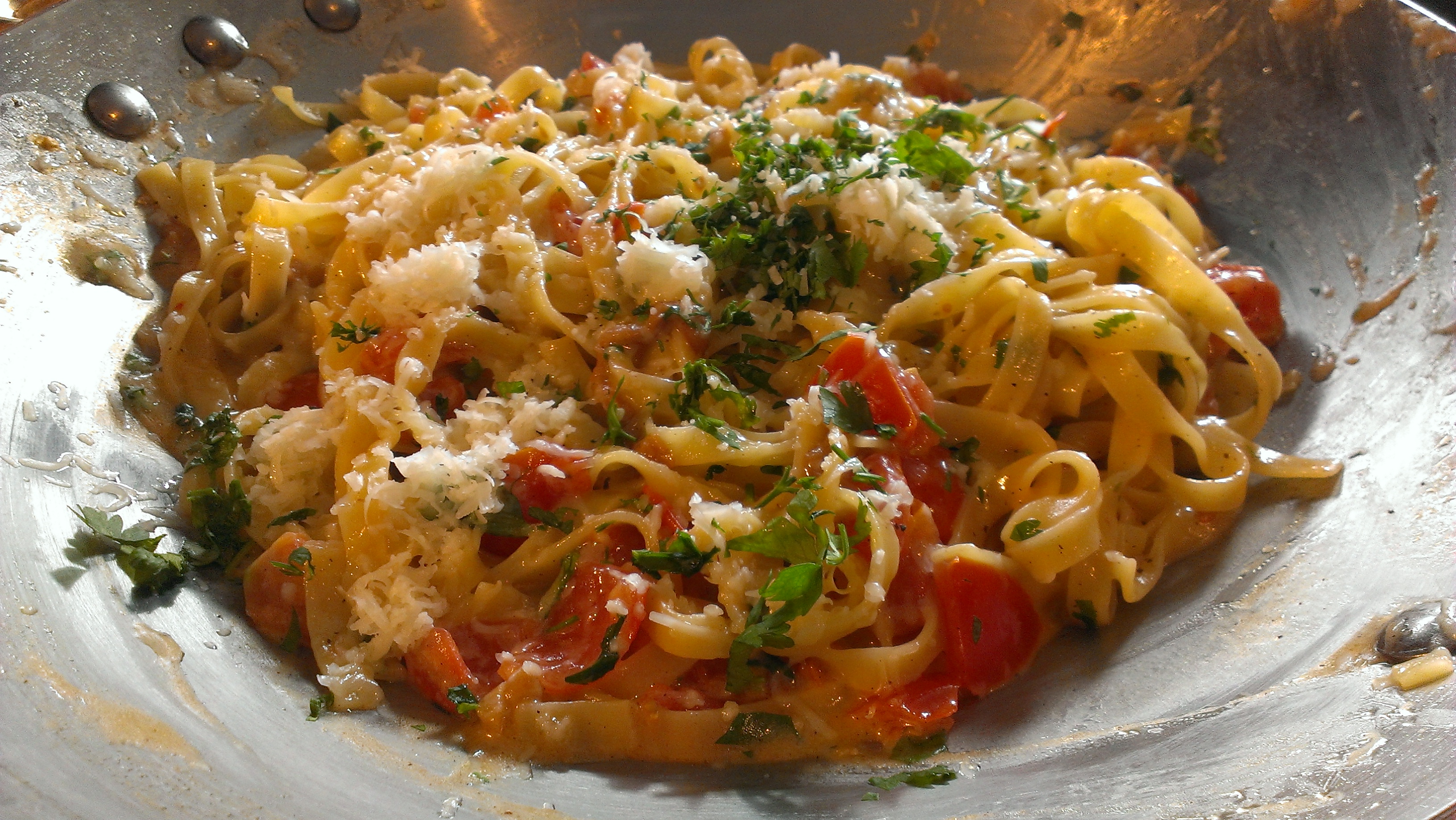Der Herstellungsalgorithmus ist nicht allzu anders als bei der Carbonara auch: Nudeln aufsetzen. Speck in einer Pfanne mit Olivenöl oder Butter anbraten. Wenn der Knusperigkeitsgrad den Individualgeschmack kitzelt, wird das Ganze mit einer großen Kelle Pastawasser abgelöscht. Auf der Hitze lassen. Nudeln wie bekannt drei Minuten weniger kochen als auf der Packung anberaumt und mit einer weiteren Kelle Pastawasser in die Pfanne geben. Dann eine Handvoll geriebenen Peccorino pro Person unterziehen, pfeffern und bis zur gewünschten Sämigkeit herunterkochen. Eventuell nachsalzen, so der Speck diese Aufgabe nicht ausreichend bewältigt hat. Wenn man an dieser Stelle auch noch entweder Tomatenpüree oder, wie ich es wesentlich lieber mag, gewürfelte Tomaten und ein bisschen Chili – vorzüglich natürlich Peperonici – dazu gibt, hat man plötzlich nicht mehr alla Gricia, sondern All’Amatriciana. Warum beides in einem Artikel abgehandelt wird, dürfte damit auch in Klarheit verbleiben. Das bemühevoll Zubereitete darf optional mit Petersilie verfeinert und mit Pfeffer und Peccorino dekoriert werden.