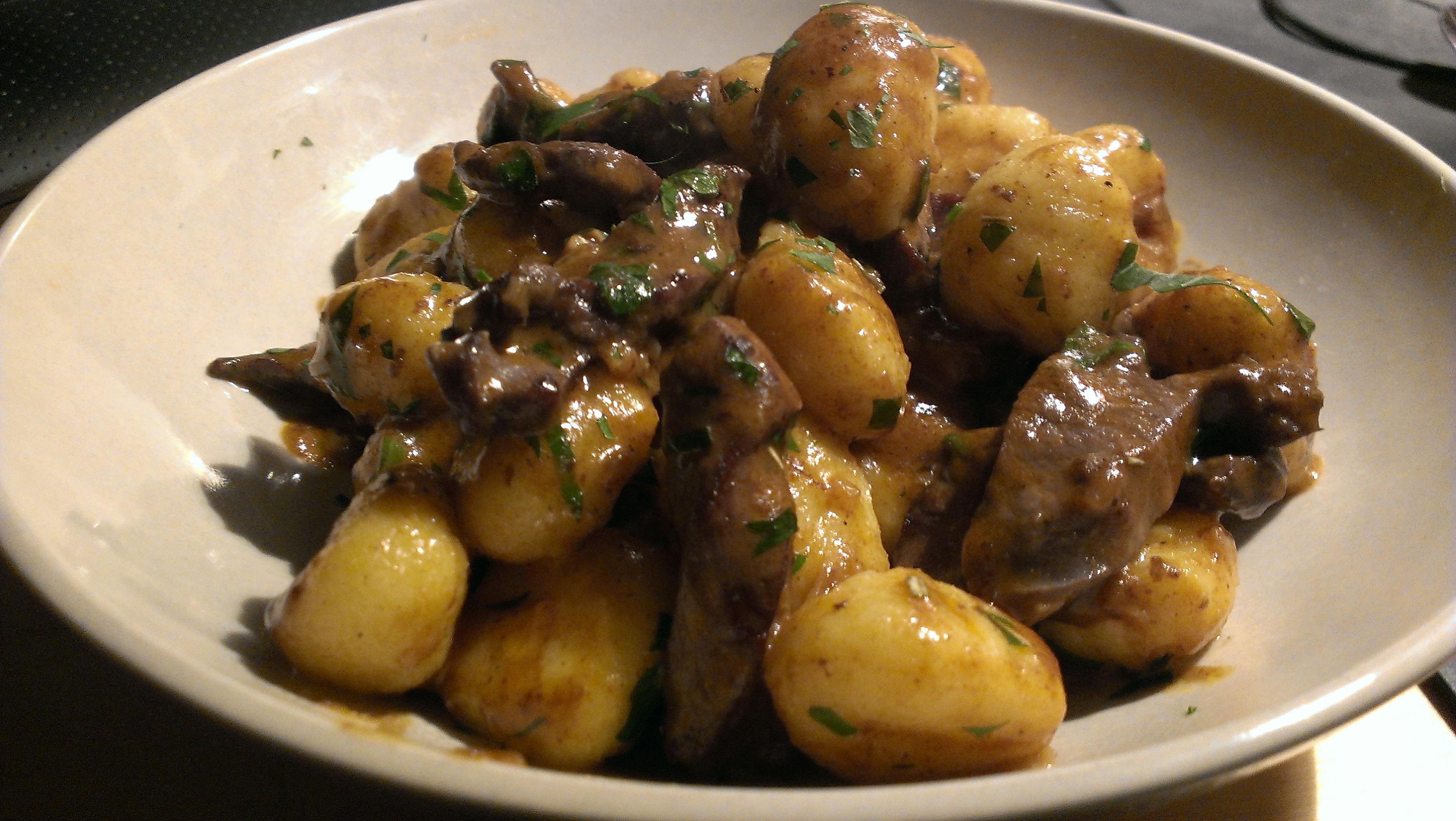 Herzen brauchen natürlich etwas Liebe. Man nimmt sich also sein Pariermesser zur Hand und entfernt alles, was nach Sehnen oder Bindegewebe aussieht. Dann wird das Fleisch (ich habe das Gericht sowohl mit Herzen vom Schwein als auch vom Rind probiert, beides schmeckt klasse – etwa 150g pro Person) in Streifen geschnitten, wie man sie auch in einem Geschnetzelten finden würde und scharf in etwas Olivenöl angebraten. Hitze runterdrehen und p.P. eine halbe gehackte Zwiebel – in meinem Fall eine Schalotte – dazu geben und glasig dünsten. Hitze wieder aufdrehen und mit einem Schuss Rotwein ablöschen. Auf ein Drittel reduzieren, Schuss (ca. 75ml p.P.) Sahne und einen deutlich kleineren Schuss (~3EL) Tomatenpüree dazu geben. Ich habe noch einen halben TL Demiglace untergezogen, ein guter Ersatz wäre ein bisschen Fond – beides ist aber optional, das Fleisch bringt auch von sich aus kräftig Geschmack für die Sauce mit. Etwas gehackten Rosmarin und Thymian dazu geben. Reduzieren lassen. Wenn es in die Bereiche der gewünschten Sämigkeit kommt, Gnocchi ins kochende und gesalzene Pastawasser geben. Wenn sie oben schwimmen, mit etwas Pastawasser in die Pfanne geben. Salzen, pfeffern, Petersilie dazu und schwenken. Abschmecken. Dieses Gericht war so lecker, dass ich es drei mal nacheinander gemacht habe. Ich musste zwischendurch sogar losfahren und neues Fleisch kaufen…