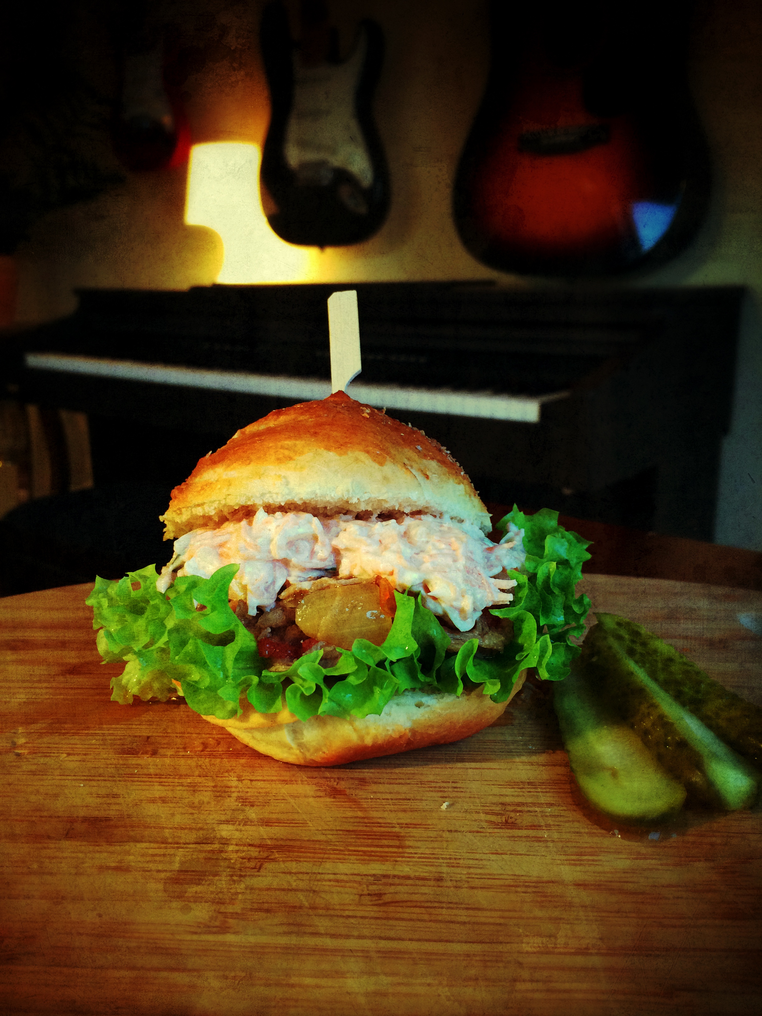 Burgerbrötchen halbieren, ein Salatblatt auf die untere Hälfte, Fleischspezialität drauf. Coleslaw, getrocknete Tomaten, geschnittene Gurke aufschichten und mit der oberen Brötchenhälfte perfektionieren. Das Ergebnis sieht dann etwa so aus: