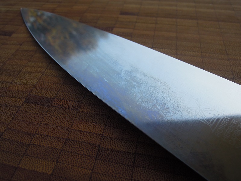 Das Messer kam mit gering ausgeprägter Patina und guter Schärfe bei mir an. Prinzipiell ziehe ich dennoch alle Messer erstmal ab, um auch frischen Stahl zu exponieren und mir ein Bild über die Reaktivität zu machen. Diese würde ich beim 1922 als „erwartungsgemäß“ oder „gewöhnlich“ bezeichnen. Erfreulicherweise zeigten sich nur sehr geringe Reaktionserscheinungen am Schnittgut (an Zwiebeln ein bisschen). Insgesamt fällt die Reaktivität aber nicht negativ auf. Gestank, wie ich ihn manchmal bei den ersten Benutzungen eines neuen Herders oder eines Opinel (dort noch mehr) feststelle, trat glücklicherweise nicht auf. Nichtsdestotrotz verlässt mich das Herder mit etwas mehr Patina als es gekommen ist.