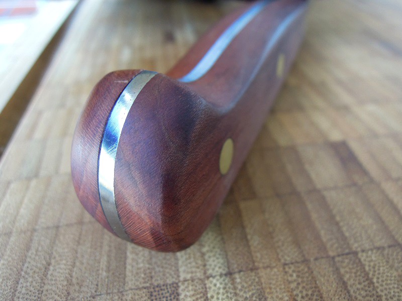 Der erste Eindruck: ein sehr schönes Messer. Sieht aus wie frisch aus der Schublade eines Schneidwarenladens. Die Klingenflanken blank poliert, wie unbenutzt. Eine winzige Schneidfase. Sehr gepflegte, leicht eingeölte Griffschalen aus wunderschönem Pflaumenholz. Und jetzt aufgepasst: an diesem Griff ist nicht der geringste Spalt erkennbar; keine Überstände; keinerlei Unregelmäßigkeiten; keine Rauhigkeiten an den Griffschalen; kein noch so winziger Grat am Erl; kein … ich mach`s kurz: hier hat jemand den perfekten Griff erwischt und darf sich des Neides so mancher Herdermesser-Besitzer gewiss sein. Das Messer ist noch relativ neu; hoffentlich bleibt der Griff so wie er jetzt ist.
