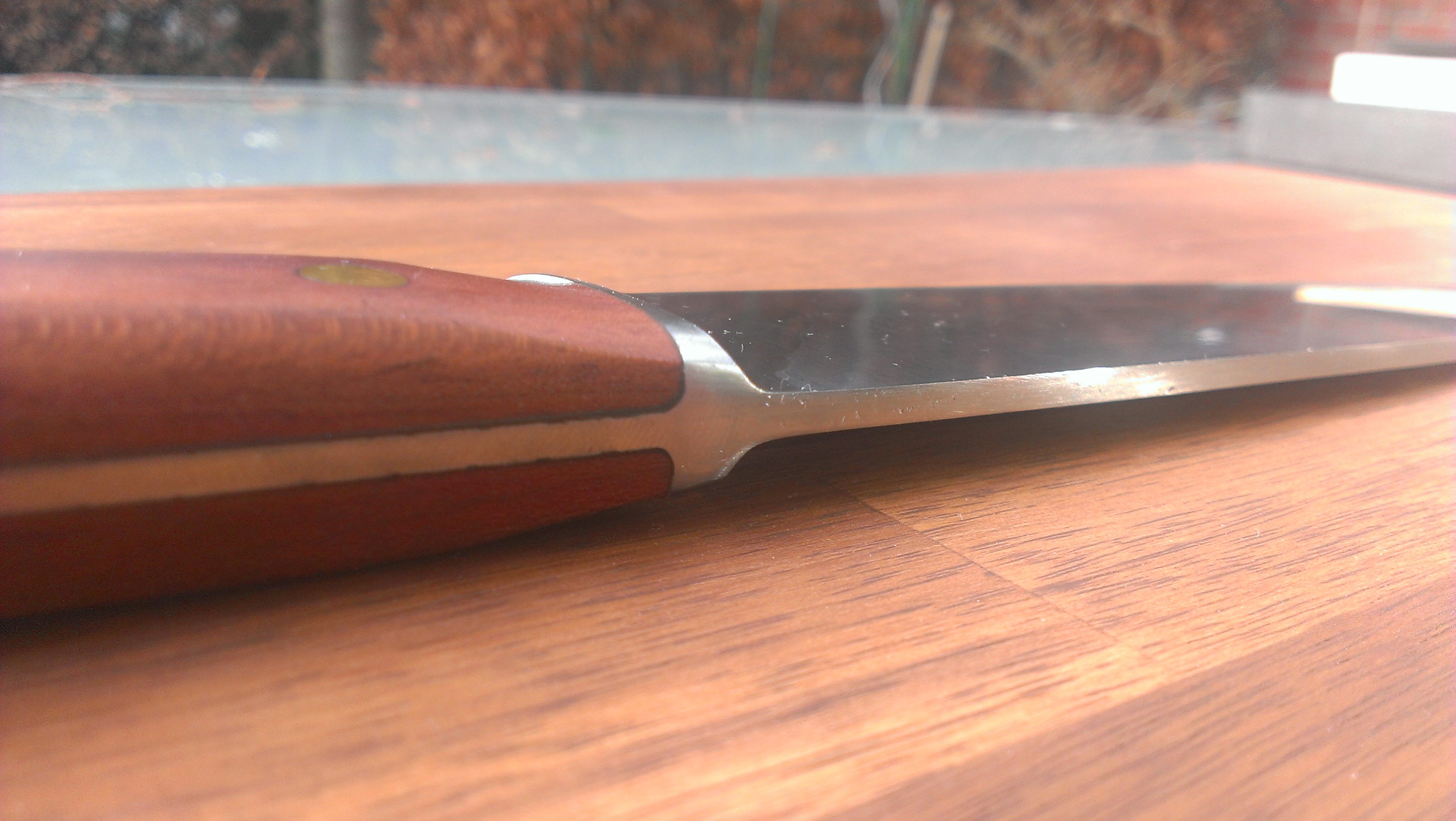 Die Klinge des klassischen Schmalkropfmessers ist aus C75W1 gesenkgeschmiedet und wird mit 60° HRC angegeben. Das Messer ist leicht zu schärfen, wird sehr scharf und hält die Schärfe auch ordentlich. Mit den Standzeiten von rostträgen Sandvik-Stählen ähnlicher Härte kann sich das 1922 aber nicht messen, der Unterschied ist fraglos da. Dafür nimmt es den Wetzstahl exzellent an und ist nach wenigen Strichen wieder voll dabei. Es gibt sich auch ziemlich lange nur mit dem Wetzstahl zufrieden, die Abstände zwischen den Grundschliffen sind lang.