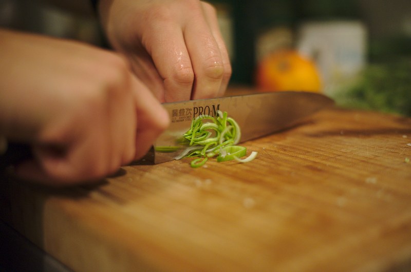 Geschnitten wurde in dem Monat der Testdauer alles Querbeet… Gemüse, Obst, Kräuter, Fleisch und Fisch. Das Messer wurde ca. für 15 Mahlzeiten für 1-4 Personen benutzt. Als Schneidunterlage kam zu 95% ein Kirschholzbrett zum Einsatz, einen Abend etwas intensiverer Nutzung erfolgte (ausnahmsweise, da unterwegs) auf einem Bambusbrett. Insgesamt habe ich das Messer einmal auf dem Compoundkit abgezogen und zweimal auf dem Diamant-Leder (+ einmal vor Weiterversand). Probleme mit Klingenausbrüchen gab es nicht.