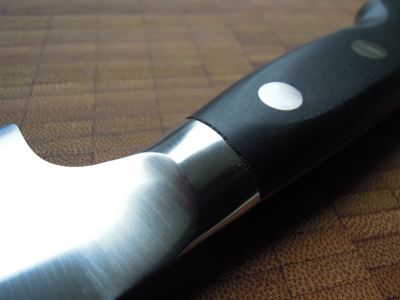 Der Kehl macht einen übertrieben ausladenden Bogen und verkürzt so entweder die nutzbare Schneidenlänge oder eben die Grifflänge. Dadurch wirkt der knubbelige Griff noch gedrungener, fast aufgestaucht. Hier wäre ein guter Zentimeter mehr an Grifflänge oder Schneidenlänge realisierbar gewesen, wenn der Kehl unmittelbar nach dem Kropf gerade abfällt und die Linienführung des Messers hätte die übliche Yo-Bocho-Uniform die wir alle zur Genüge kennen. Im Pinch-Grip greift die Hand weit über den Klingenrücken und tief in das Messer hinein, bei einer 180er Klingenlänge habe ich das fast als zu viel des Guten empfunden!