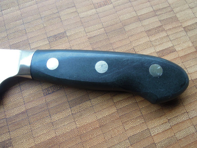 Soweit ich weiß ist das Messer schon seit einigen Jahren im ständigen Einsatz. Aber selbst dies im Hinterkopf, lassen Verarbeitungsqualität und Haptik zu wünschen übrig. Im Vergleich mit anderen Yo-Gyutos ähnlicher Preisklasse – wie z.B. dem Fujiwara FKM, welches ich letzten Monat im Test hatte – ist die Haptik und der optische Eindruck des Materials eher billig. Die Verarbeitung des Griffs weist ebenfalls einige Mängel auf (insbesondere im Übergangsbereich zur Klinge). Das geht in dieser Preisklasse und auch darunter schon doch deutlich besser!