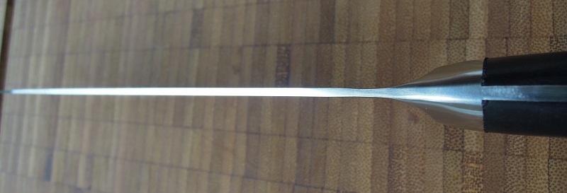 Zwar ist die Klinge “nur” aus dem japanischen Wald-und-Wiesen-Chrom-Moly-Stahl, aaaaaaber! Erstens ist die Verarbeitung wunderbar: Die Klinge ist gerade, der Schliff gleichmäßig und vom Finish auf einem sehr hohen Niveau, von dem sich fast alle Firmen am Markt etwas abschneiden könnten. Zweitens ist die Standzeit des Stahls ziemlich gut, was auf eine exzellente Wärmebehandlung schließen lässt. Ich habe ihn nur ein oder zwei mal kurz über den Keramikstab gezogen in den vier Wochen, in denen ich regelmäßig mit dem Messer gearbeitet habe. Am Ende wurde das Messer auf dem Finisher aufgefrischt – gebraucht hätte es das nicht. Und letztlich – und wichtigst – ist die Geometrie der Klinge super. Sie ist sowieso schon ziemlich dünn, dann kommt aber auch noch eine konvex fast auch null geschliffene Schneide dazu. Ich bin hin und weg.