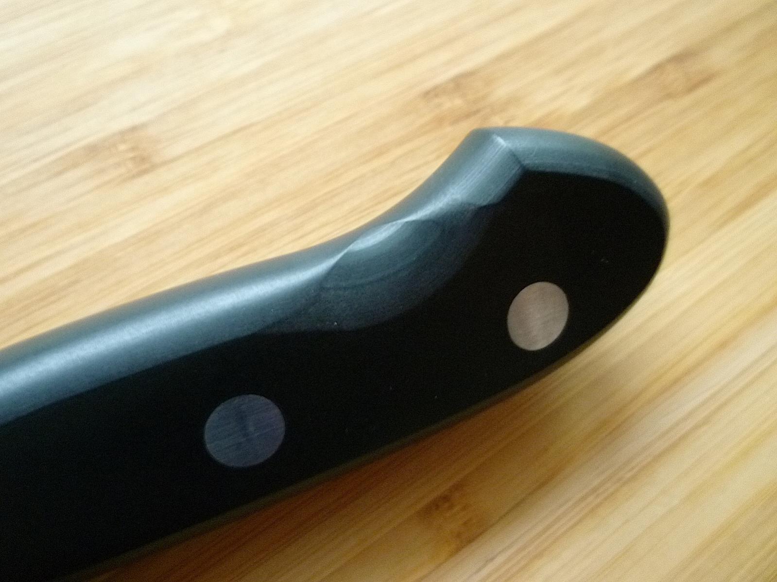 Er wirkt auf mich optisch wie Bakelit, trocken, tiefschwarz nachgedunkelt, matt und spröde durch Spülmittelkontakt. Ich vermute der jahrelange Gebrauch zeigt seine Spuren. Dieses rundliche und knubbelige wird von den beiden Kerben grob gebrochen. Diese Kerben sollen wohl die Haptik verbessern, verschlimmern in Wahrheit aber nur das optische Erscheinungsbild! Das ist einfach missglückt! Bis auf den kleinen ein, wenig aufgequollenen Spalt zwischen beiden Griffschalen und Kropf, der erstaunlich gleichförmig über 360° verläuft, finde ich nichts zu beanstanden.