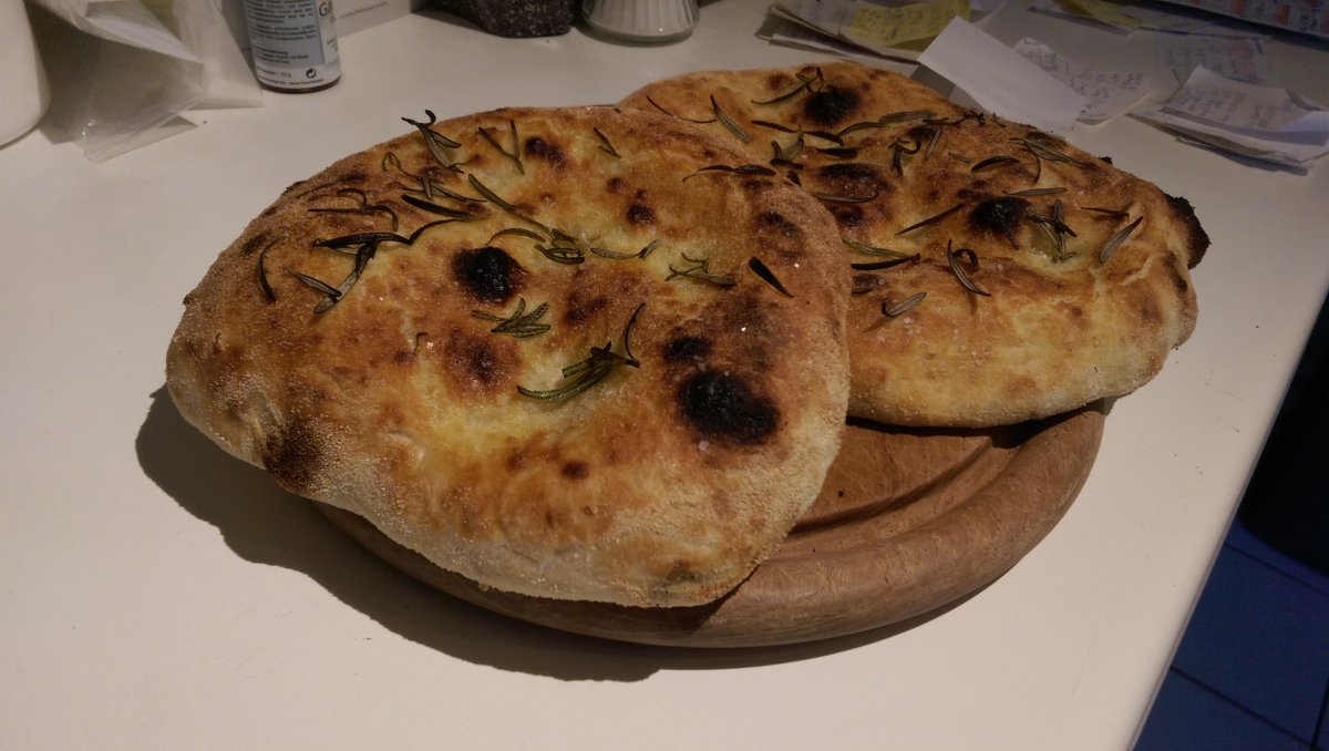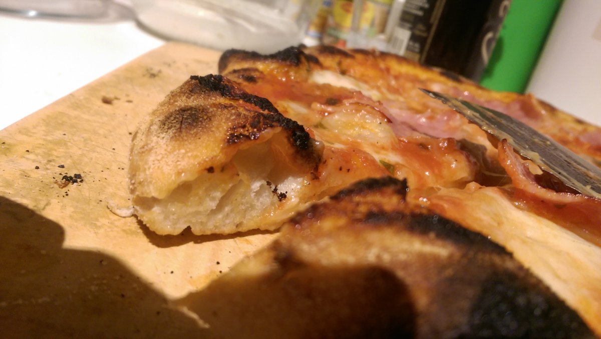 Da haben wir mal wieder richtig schön Pizza gemacht. Teig war der kampferprobte No Knead Pizzateig (70% Hydratation, 3% Salz, 1/4TL Trockenhefe pro 500g Mehl, 18h Stockgare, 3h Stückgare), Tomaten waren pürierte Fleischtomaten von Mutti mit S+P und Olivenöl. Ordentlich abgetropfter Büffelmozzarella. Guter Prosciutto cotto. Gebacken auf dem Brotbackstein im Ofen bei maximaler Grilltemperatur – 2cm Pizzasteine sollten mindestens eine halbe Stunde vorgeheizt werden, dickere Steine brauchen deutlich länger, pro cm mindestens 15 Minuten. Dieses mal habe ich 40% 630er Dinkelmehl von der Adlermühle benutzt. Beste Pizza seit ganz langer Zeit. Und aus dem selben Teig etliche Focaccia mit gutem Olivenöl (Olivastro), Salz und Rosmarin aus dem Garten. Man sollte direkt einige mehr einplanen, die gehen ruckzuck weg.