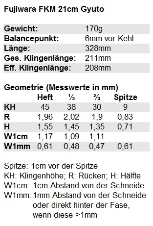 Es handelt sich um ein Messer aus klassischem Chrom-Molybdän-Stahl, der untersten Kategorie japanischer Messerstähle. Es ist aber zu betonen, dass der Stahl immer noch über dem deutschen Standard-Messerstahl (1.4116) angesiedelt ist und bei einer höheren Gebrauchshärte von 57 – 58° HRC ein ähnliches Gefüge bietet und genauso auf dem Wetzstahl scharf gehalten werden kann. Für ein Gebrauchsmesser, an das keine außergewöhnlichen Ansprüche gestellt werden, ist das schon in Ordnung, auch wenn natürlich kräftig Luft nach oben ist. Entsprechend wichtiger wäre eine gute Schneidengeometrie, um die nur durchschnittliche Schneidfreudigkeit und Standzeit zu kompensieren. Hier kann das FKM leider nicht liefern – aber der in amerikanischen Foren oft zitierte Vergleich mit Masamoto wird plötzlich sehr klar: Sowohl das Profil als auch die Geometrie sind fast exakt gleich. Mich hat das sehr enttäuscht, denn diese Dicke ist auch mit Unempfindlichkeit nicht mehr zu rechtfertigen. Besonders ärgerlich ist das vor dem Hintergrund, dass neben dem Griff auch die Verarbeitung in Ordnung ist; die Klinge ist gerade, das Finish gleichmäßig, der Schliff erlaubt sich geringe Unregelmäßigkeiten (siehe Geometrie-Tabelle), die aber praktisch nicht aufgefallen wären. Zur Schnitthaltigkeit kann ich mich nicht wirklich äußern, da ich das Messer nicht exzessiv eingesetzt habe. Ein paar Züge auf dem Stahl reichten zur Aufrechterhaltung der Gebrauchsschärfe.