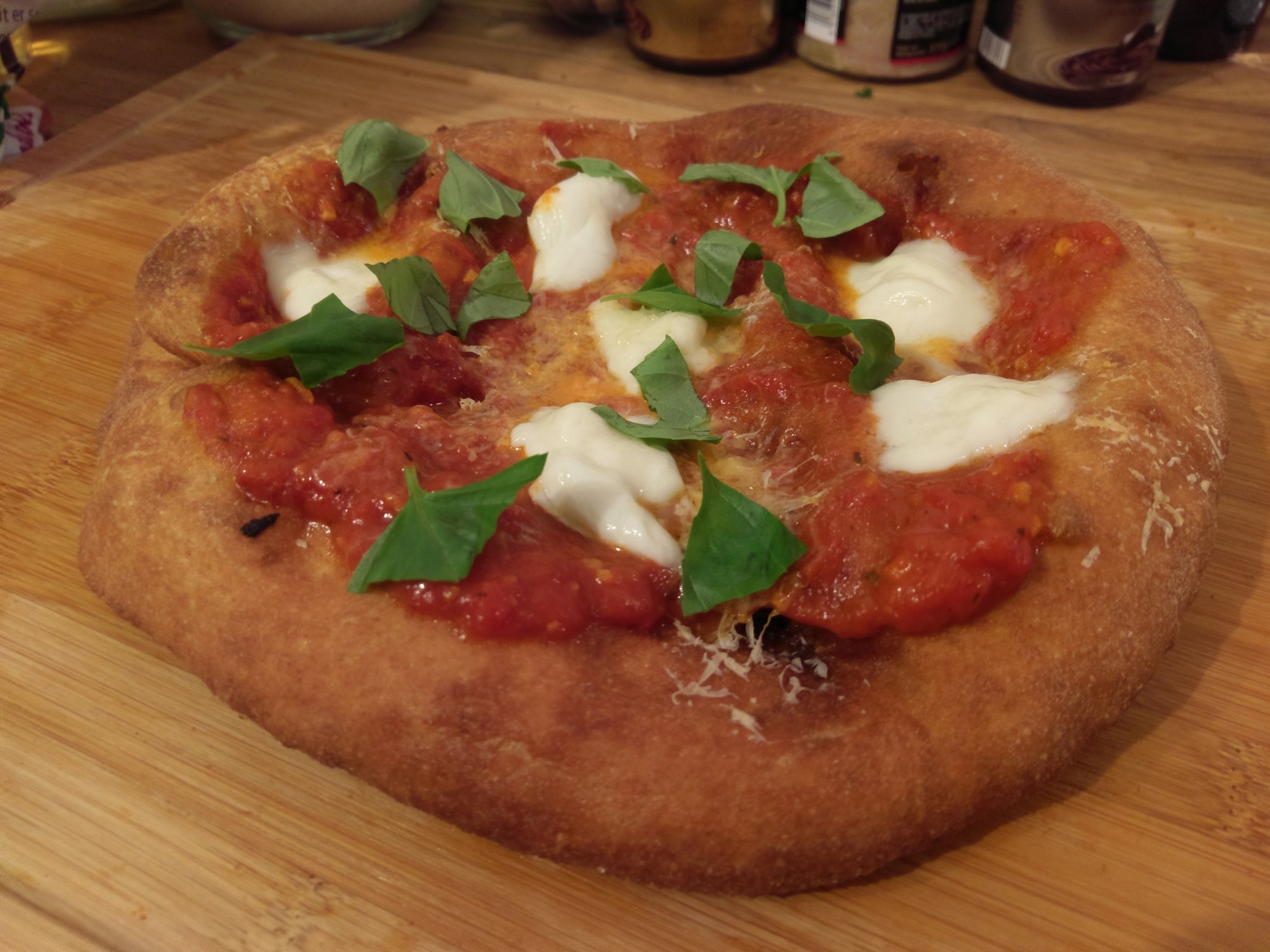 Es gab mal wieder Experimente. Ich war guter Dinge, deshalb traute ich mich, das ganze direkt für Freunde zu machen. Ich hatte schon vor längerer Zeit gesehen, dass Roberto Carporuscio (von Kesté) und sein Mentor Antonio Starita im Don Antonio mit einer frittierten Pizza eine regelrechte Welle losgetreten hat und wollte das auch mal ausprobieren (Video). Frittierte Pizza ist wohl in Neapel eine sehr weit verbreitete Sache, hat aber erst mit der „Montanara“ genannten Variante von Starita mit Ragú und geräuchertem Mozzarella in Amerika richtig Fuß gefasst. Ich habe einen einfachen, kurz geführten Pizzateig genommen (70% 405, 20% 630 Dinkel, 10% Dinkel Vollkorn; 60% Hydratation, 3% Salz, 1% IDY, 2% aktives Backmalz, 3% Olivenöl, 1% Zucker, 2h RT, dann 1/2h Stückgare) und in ausreichend heißem Rapsöl frittiert. Dabei sollte man die Mitte sowohl mit den Fingern ein bisschen kräftiger einstauchen als auch beim Frittieren mit einer Kelle eindrücken, ansonsten pufft der Teig zu stark auf. Darauf eine lang gekochte neapolitanische Tomatensauce (Knoblauch in Olivenöl anschwitzen, von Hand fein zerdrückte San Marzano Tomaten und ein Bund Basilikum dazu und dann auf kleinster Flamme köcheln lassen) und ein paar Stücke Büffelmozzarella sowie Büffelmilch-Parmesan verteilen und kurz unter den Grill stellen, dass der Käse gerade schmilzt. Basilikum drauf und dann so schnell wie möglich essen. Liebe Freunde .. Ich hatte schon lange nichts so leckeres mehr. Macht es – es lohnt sich.