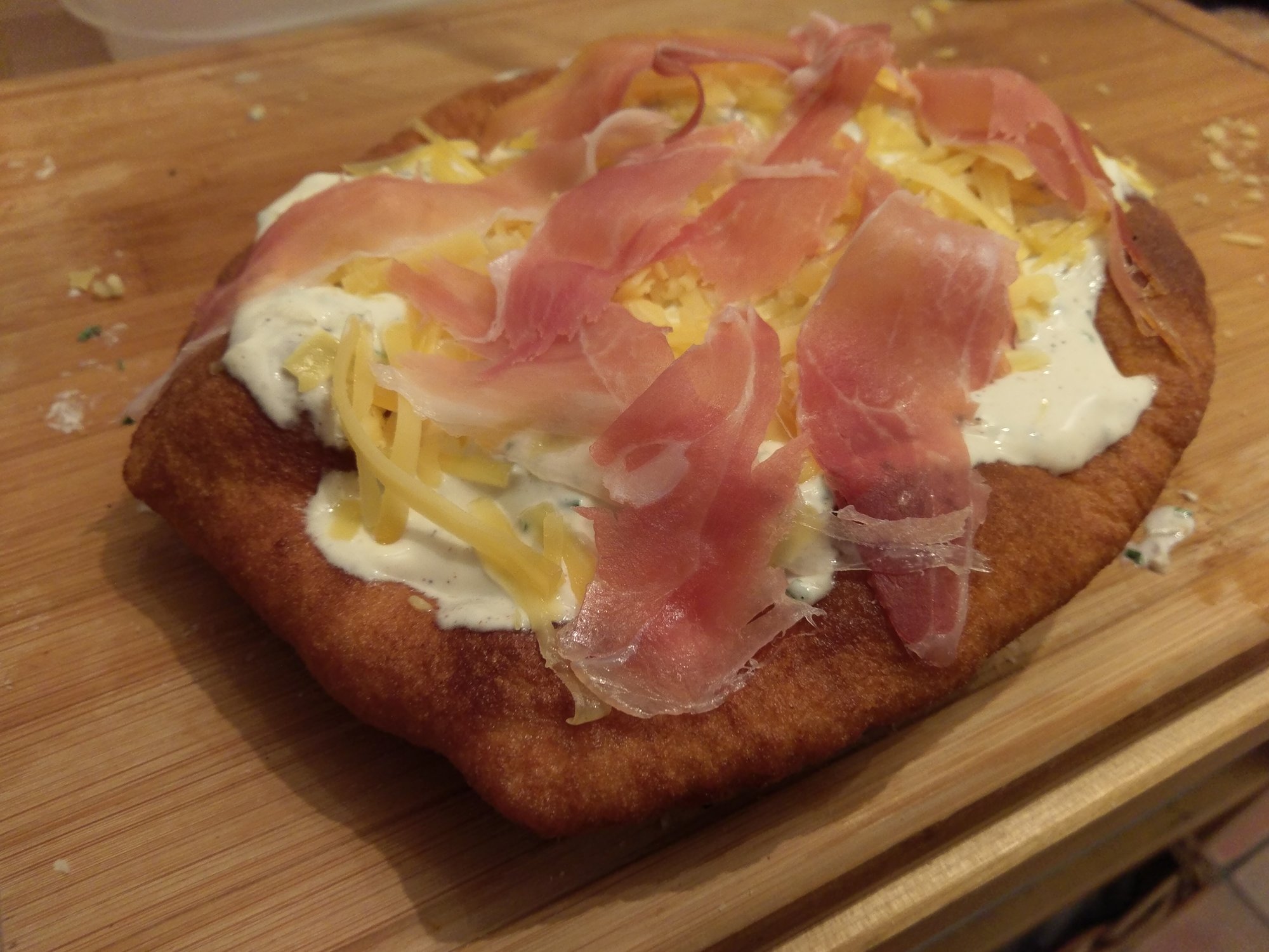 Wenn man schon einen großen Topf Öl auf dem Herd stehen hat und gerade erst herausgefunden hat, wie fantastisch die Ergebnisse sind, gibt es wenig Gründe, nicht auch ein bisschen Lángos (bzw Langosz, Langosch) zu machen. In vielen Rezepten findet man ein paar Esslöffel, ein Drittel oder sogar die Hälfte Milch. Tests zu den Auswirkungen auf den Teig stehen bei mir noch aus. Ich habe bei dem Teig hier mit etwas mehr Vollkorn (25%) experimentiert als bei dem Teig weiter oben und würde das nicht wieder tun. Der Teig war ein bisschen zu zäh zu essen und riss sehr leicht beim Ausziehen. Dafür war der Belag großartig: Selbstgemachtes Creme Fraîche mit frischen Kräutern, S+P, Pimenton und Knoblauch, grob geriebener Beemster Royaal – ein Käse, der sich sehr schnell als mein Lieblingsgouda etabliert hat, weil er meiner Meinung nach den perfekten Alterspunkt trifft .. und nebenbei inzwischen fast überall zu haben ist – und luftgetrockneter westfälischer Knochenschinken. Nicht ganz so gesund wie roher Brokkoli – aber dafür ein Essen, von dem man Wunschträume bekommt.