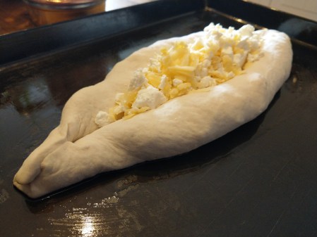 Traditionell wird Sulguni als Käse verwendet, aber erstens bekomme ich den hier nicht und zweitens schwant mir, dass es eher das ist, was in Georgien zur Hand ist, nicht unbedingt das beste für den Job. Ich habe jeweils 80g Feta, mittelalten Gouda und halbfeuchten geriebenen Mozzarella genommen. Ich glaube, eine sehr gute Idee wäre hier auch ein Brie oder Camembert (von Speckwürfeln gar nicht zu sprechen…). Der Käse wird grob gerieben und mit einer Prise Pimenton vermischt. Den Teig ungefähr auf Größe eines DIN A4 Blattes eckig ausrollen, dann werden zwei Rollen aus jeweils einem Drittel des Käses entlang der langen Seiten verteilt und diese eingerollt. Wenn man jetzt die Enden kräftig zusammen drückt und verschließt, sollte man ein Schiffchen vor sich haben. Der restliche Käse wird dann in der Mitte untergebracht und das ganze auf einem eingeölten Backblech oder Backpapier (in letzterem Fall am besten direkt auf dem Backpapier bauen) bei 250°C O/U für ca. 15 Minuten gebacken.