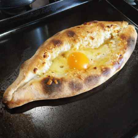 Dann den Käse in der Mitte mit einem Esslöffel herunter drücken und ein Ei hinein schlagen. Noch einmal für drei Minuten in den Ofen stellen – das wichtigste ist, das Ei nicht zu überkochen, es sollte noch deutlich wabbeln, wenn es aus dem Ofen kommt. Bis man das Khachapuri schließlich isst, kocht die Restwärme in dem Brot das Ei noch ein ganzes Stück weiter. Zwei Schnitten Butter im Ei versenken und das ganze mit Salz und Pfeffer bestreuen. Und dann wird das eine in das andere gedippt, dass die Endorphine nur so Partsa tanzen. .. Das ist ein georgischer Tanz. Glauben Sie mir. Ich habe nachgeguckt.