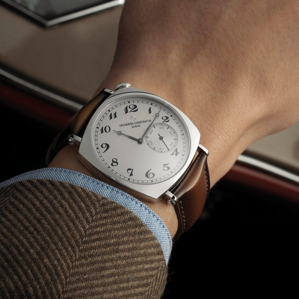 Als ich die 1921 vor einigen Jahren das erste Mal in einem Video gesehen habe, stolperten Belächeln, Verwirrung und übermannende Begierde in wenigen Momenten übereinander. Die Uhr, deren Vorbild aufgrund ihrer geplanten Verwendung als Fahreruhr 45° schräg in einem rechteckigen Gehäuse sitzt, hat fuderweise von diesem ephemeren je ne sais quoi, das alle Firmen die ganze Zeit wie Blitze in der Flasche zu fangen suchen. Die Uhr ist extrem dünn und in jeder Raumrichtung tailliert, sodass sie quasi aus jeder Perspektive perfekt aussieht. Es gibt sie in zwei Größen und, damit sie auch schön teuer ist, nur in Weiß- oder Gelbgold. Die Materialwahl ist in dieser Hinsicht extrem erfolgreich – die 1921 kostet 36 bis 44 Kiloeuro, je nach Größe. Wenn man mich in der Vacheron Auslage alleine lassen würde, wäre die Weißgoldvariante in 40 mm meine Wahl. Ich vermute, man bekommt einen Bugatti Typ 59 gratis dazu. Alles andere wäre albern.