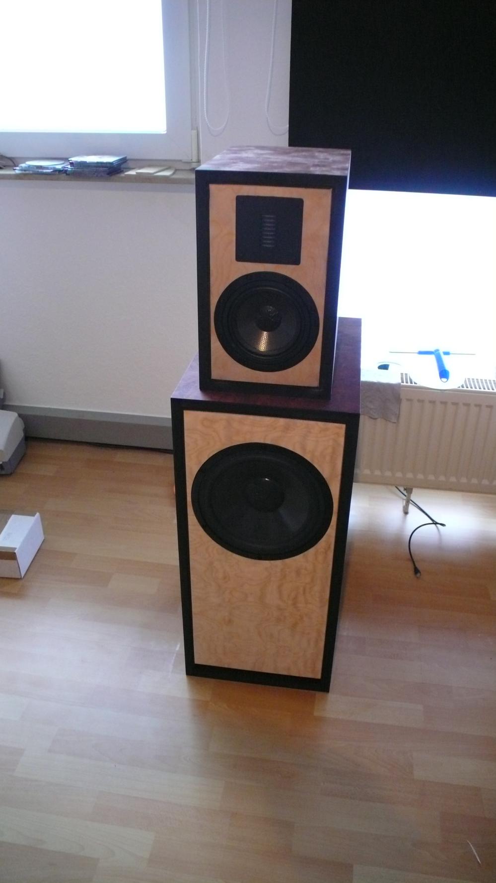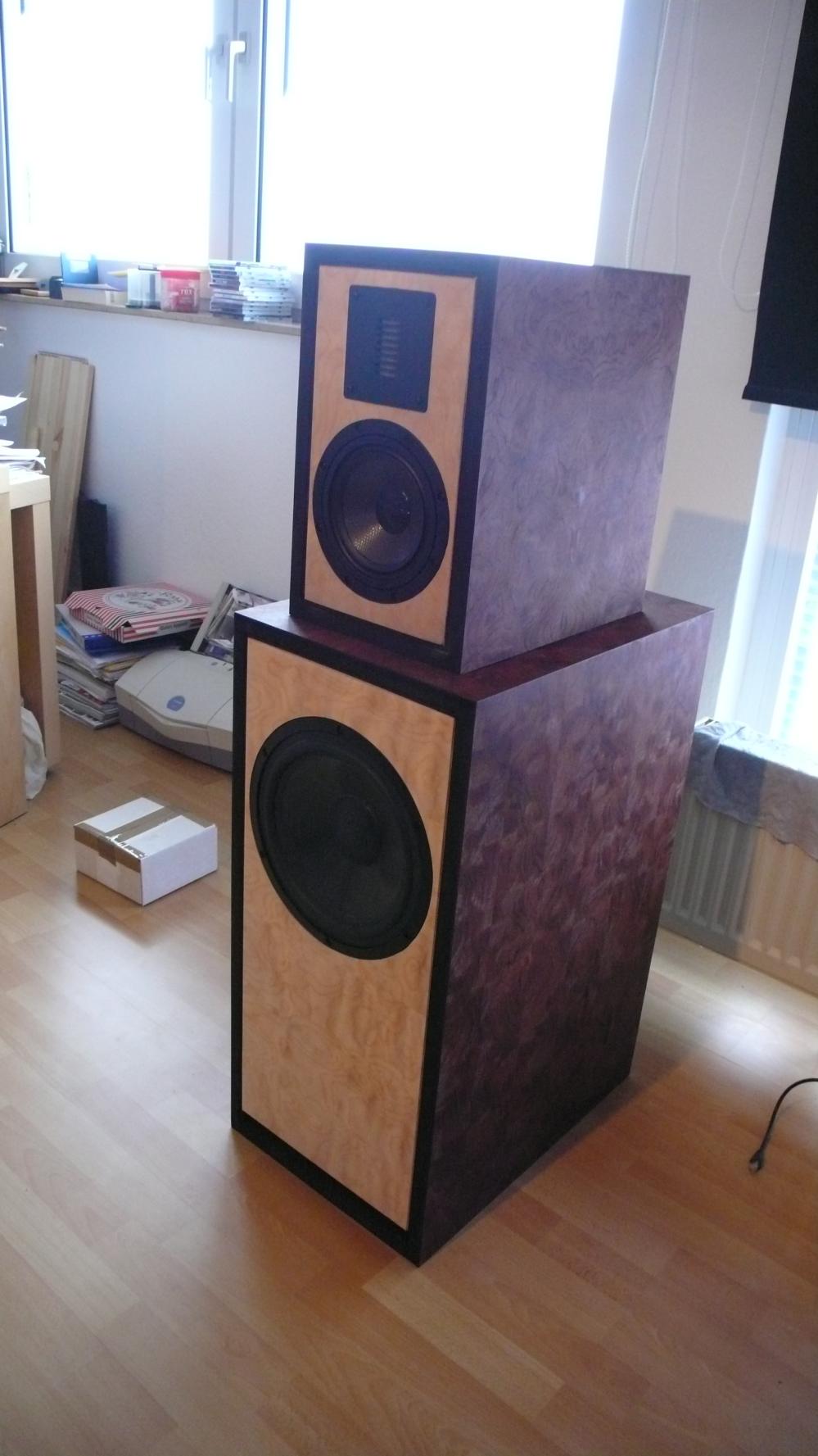 Womit wir beim finalen Fehler wären: Ich hatte Angst, das teure Furnier zu ruinieren und gab die Boxen daher zu einem Tischler. Ich übersah die Möglichkeit, dass ein Mensch, der super nett ist und sonst spitzen Arbeiten macht, möglicherweise keine Ahnung vom Furnieren haben könnte. Jetzt wirft das Furnier überall Blasen, so genannte „Kürschner“, ein so gut wie nicht zu korrigierender Fehler. Derart große Flächen sollte man nicht mit Kontaktkleber zu furnieren versuchen, da man eh nicht so flächig gleichmäßig genug Druck aufbringen kann, sondern beide Teile einleimen, den Leim trocknen lassen und dann das Furnier mit einem Bügeleisen aufbügeln.